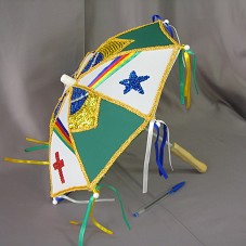 SOMBRINHA DE FREVO (40X36,5 CM) COM CABO EM MADEIRA. POSSUI POSSUI LONA BRANCA INTERCALADA COM LONA VERDE. NA BRANCA, BORDADOS EM LANTEJOULAS E FITAS DE CETIM FAZENDO ALUSÃO À BANDEIRA DE RECIFE; NA VERDE, BORDADO EM LANTEJOULA, RELACIONADO À BANDEIRA NACIONAL BRASILEIRA. POSSUI FITAS DE CETIM AMARRADAS NAS EXTREMIDADES.