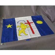 BANDEIRA (65X45 CM) EM FAIXAS VERTICAIS: UMA AZUL, UMA BRANCA E OUTRA AZUL. NAS AZUIS, UMA ESTRELA E UM SOL EM AMARELO; NA BRANCA, UM LEÃO SEGURANDO UMA CRUZ VERMELHA E 'VIRTUS ET FIDES'. DESENHOS E CORES EM ALUSÃO À BANDEIRA DE RECIFE.