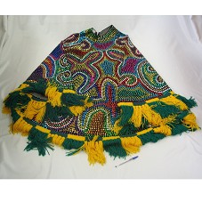 MANTO COMPRIDO (124 CM) EM VELUDO PRETO, TIPO SAIA, COM FORRO EM TNT CINZA E BABADO TRANÇADO EM LÃ NAS CORES VERDE E AMARELO, COM FRANJA NAS EXTREMIDADES. SAIA TODA BORDADA EM LANTEJOULAS COLORIDAS.