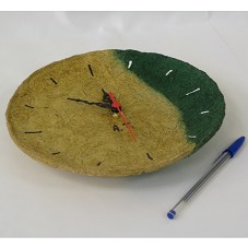 RELÓGIO DE PAREDE, DE FORMATO CIRCULAR (23,5X4 CM) CONFECCIONADO COM CASCA DE LARANJA E FIBRA DE CANA DE AÇÚCAR, NAS CORES OCRE, E VERDE. POSSUI A INSCRIÇÃO 'AT' NA FRENTE. ACOMPANHA CARTÃO DE VISITA DA 'ARTE DA TERRA - ARARAQUARA'. ACONDICIONADO EM CAIXA SEXTAVADA DE PAPELÃO, COM MESMA INSCRIÇÃO NA TAMPA.