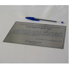 PLACA (19,5X13,7 CM) EM METAL PRATEADO, COM INSCRIÇÃO EM AZUL, 'AO EXCELENTÍSSIMO SENHOR PRESIDENTE DA REPÚBLICA LUIZ INÁCIO LULA DA SILVA / O GRÊMIO RECREATIVO ESCOLA DE SAMBA PORTELA (GRESP), SENHORADO, OFERECE ESTA PLACA COMO LEMBRANÇA DA HONROSA E INESQUECÍVEL VISITA DE VOSSA EXCELÊNCIA A SUA QUADRA, POR OCASIÃO DA CERIMÔNIA DE ABERTURA DO SEMINÁRIO IMPLANTAÇÃO DAS METAS DO MILÊNIO EM OSWALDO CRUZ E MADUREIRA. RIO DE JANEIRO, 05 DE NOVEMBRO DE 2004. NILO MENDES FIGUEIREDO / PRESIDENTE'. ACONDICIONADA EM ESTOJO AZUL ROYAL (22,5X18X3 CM).