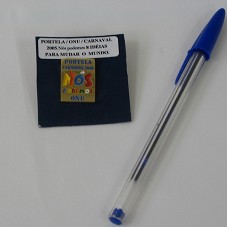 BROCHE (2X2,5 CM) EM METAL DOURADO, NA FRENTE, EM AZUL, AMARELO, LARANJA E VERMELHO, 'PORTELA / CARNAVAL 2005 / NÓS PODEMOS / ONU'. PRESO A PAPEL AZUL MARINHO, COM ETIQUETA 'PORTELA / ONU / CARNAVAL 2005. NÓS PODEMOS 8 IDÉIAS PARA MUDAR O MUNDO.'.