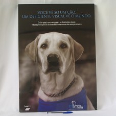 CARTAZ EMOLDURADO (45,5X63,5 CM). TRAZ A FOTOGRAFIA DE UM CÃO, EM FUNDO PRETO, E A INSCRIÇÃO 'VOCÊ VÊ SÓ UM CÃO. UM DEFICIENTE VISUAL VÊ O MUNDO. / O CÃO-GUIA É UM AVANÇO PARA OS DEFICIENTES VISUAIS. NÃO SE PREOCUPE! ELE É ADESTRADO, INOFENSIVO E NÃO AVANÇA EM VOCÊ.'. NA PARTE INFERIOR, NOMES DAS INSTITUIÇÕES DE APOIO E 'INTEGRA / INSTITUTO DE INTEGRAÇÃO SOCIAL E PROMOÇÃO DA CIDADANIA'.