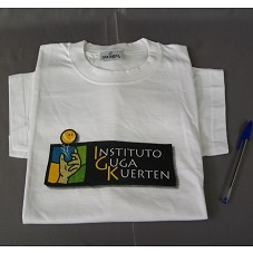 DUAS CAMISETAS IGUAIS (TAM M E G), EM MALHA BRANCA, DE MANGA CURTA. NA FRENTE, NO CENTRO SUPERIOR, UM RETÂNGULO PRETO COM ESTAMPA DE UMA MÃO JOGANDO UMA BOLA DE TÊNIS E 'INSTITUTO GUGA KUERTEN'.