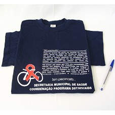CAMISETA (TAM G) EM MALHA AZUL MARINHO, DE MANGA CURTA. NA FRENTE, EM BRANCO E VERMELHO, UMA BICLETA E O SÍMBOLO DA CAMPANHA DE LUTA CONTRA AIDS (LAÇO VERMELHO); E, AO LADO DA FIGURA, TEXTO 'SEM PRECONCEITO' E 'SECRETARIA MUNICIPAL DE SAÚDE / COORDENAÇÃO PROGRAMA DST/HIV/AIDS'.