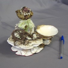 ARTESANATO (19X12X13 CM) FEITO EM CONCHAS, ESCAMAS DE PEIXE, DUREPOX E CORAL. MOSTRA UM PESCADOR TIRANDO OS PEIXES PRESOS NA REDE. NA BASE INFERIOR, NA PARTE FRONTAL, 'NADIA'. POSSUI UMA CONCHA GRANDE FIXADA AO LADO DO PESCADOR.