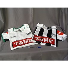 DUAS CAMISAS OFICIAIS (TAM G) DO FIGUEIRENSE FUTEBOL CLUBE. O PRIMEIRO MODELO, COM LISTRAS VERTICAIS NAS CORES PRETA E BRANCO, COM O BRASÃO DO TIME NA FRENTE. O SEGUNDO, BRANCA COM DETALHES LATERAIS PRETO E COSTURA VERDE. AMBAS DE NÚMERO '13' E COM SELO DE AUTENTICIDADE.