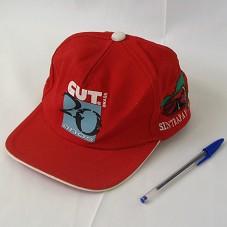 BONÉ EM BRIM VERMELHO. NA FRENTE, ESTAMPA BRANCA, AZUL E PRETA, COM A INSCRIÇÃO 'CUT BRASIL / 20 ANOS'. NAS LATERAIS, BORDADO EM VERDE, PRETO, AMARELO E BRANCO, DESENHO DE UMA ESTRADA E CONTORNO DO MAPA DE SANTA CATARINA E 'SINTRAPAV-SC'.