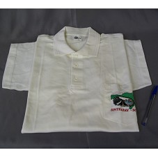CAMISA GOLA PÓLO (TAM GG) NA COR CREME, DE MANGA CURTA. NA FRENTE, BOLSO NO LADO ESQUERDO COM BORDADO EM VERDE, PRETO, AMARELO E AZUL, DESENHO DE UMA ESTRADA E CONTORNO DO MAPA DE SANTA CATARINA E 'SINTRAPAV-SC', EM VERMELHO.