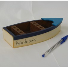 MINIATURA DE CANOA (20,5X9,5X4 CM) EM MADEIRA MDF, COM BORDA E PONTEIRA PINTADAS EM AZUL, CASCO EM CREME E INTERIOR EM MARROM. NO LUGAR DOS BANCOS, DUAS MADEIRAS COM TRÊS FUROS CADA. NAS LATERAIS, 'PRAIA DO SONHO' E 'PALHOÇA-SC'.