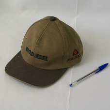 BONÉ EM BRIM ESVERDEADO, COM ABA MAIS ESCURA. BORDADO NA FRENTE, 'BIODIESEL'. NAS LATERAIS, 'AGROPALMA' E 'ECOMAT'.
