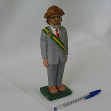 ESCULTURA EM RESINA (23 CM) RETRATANDO O PRESIDENTE LULA DE TERNO, COM A FAIXA PRESIDENCIAL, VESTINDO SANDÁLIAS E CHAPEÚ DE CANGACEIRO. NO CANTO DIREITO DA BASE, 'DEODATO 2003'.