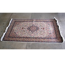 TAPETE (182,5X274 CM) COM MOTIVOS FLORAIS, PREDOMINANDO OS TONS DE MARROM, BEGE E VERMELHO. POSSUI FRANJAS NA COR CREME EM DUAS EXTREMIDADES. ACONDICIONADO EM CAPA VERDE. ACOMPANHA CARTÃO DO REMETENTE.