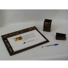 UM CONJUNTO DE ESCRITÓRIO, COMPOSTO POR: UM RISQUE-RABISQUE (35,5X26 CM) EM MADEIRA REFLORESTADA, COM UM LÁPIS DE TRONCO DE ÁRVORE AMARRADO A ELE E FOLHAS COM LOGOMARCA DO 'INSTITUTO MADEIRA DA TERRA'; UM PORTA-CANETAS (7X7X10,5 CM); E UM PORTA PAPEL DE RASCUNHO (9X4,5X5 CM). TODOS EM MADEIRA ESCURA COM RAJADOS CLAROS. ACONDICIONADO EM CAIXA (53X30,5X11 CM) FORRADA DE JUTA, COM UMA FITA DE CETIM VERMELHO NA TAMPA.