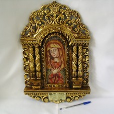 PINTURA SOBRE TELA (9X22,5 CM) COM IMAGEM DE UMA SANTA, COM MANTO VERMELHO E VERDE, VÉU E DETALHES DOURADOS. MOLDURA (30,5X46,5 CM) EM MADEIRA PINTADA DE DOURADO. MOLDURA LEMBRANDO PÓRTICO BARROCO. NA PARTE INFERIOR, PLACA DOURADA (8X4,5 CM) COM A INSCRIÇÃO 'SEÑOR PRESIDENTE EN AGRADECIMIENTO A SU VISITA / CARLOS VALENCIA MIRANDA / ALCALDE DE LA MUNICIPALIDAD DEL CUSCO / CAPITAL HISTÓRICA DEL PERÚ / CUSCO, 07 DE DICIEMBRE 2004'.