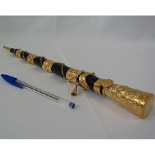 BASTÃO DE COMANDO INCA (39,5 CM) EM MADEIRA PINTADA DE PRETA COM DETALHES EM METAL DOURADO. POSSUI A INSCRIÇÃO 'CARLOS RICARDO CUARESMA SANCHEZ / PRESIDENTE'. E BRASÃO DO 'GOBIERNO REGIONAL CUSCO'. ACONDICIONADO EM CAIXA VERMELHA (44,5X8,5X6 CM) COM DETLAHES DOURADOS E MESMA INSCRIÇÃO NA TAMPA, INTERNA E EXTERNAMENTE.