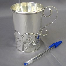 CANECA EM PRATA 925 (6,5X8,5X11,5 CM). NA BASE, DESENHOS DE ROSAS GRAVADOS; A ALÇA, EM FORMATO DE SERPENTE. ACOMPANHA CARTÃO DO REMETENTE.