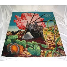 PAINEL EM TAPEÇARIA (113X134 CM), PREDOMINANDO OS TONS DE MARROM, VERDE, AZUL E VERMELHO, MOSTRANDO PARTE DE UMA PLANTAÇÃO DE ABÓBORAS E MILHO; UM TRONCO, ONDE HÁ UM MACHADO, UMA FOICE E UMA ENXADA; E, NO FUNDO, UMA FUMAÇA AVERMELHADA. NO CANTO INFERIOR ESQUERDO, 'VALLADÃO / BH-73'.