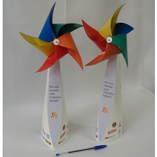 DOIS CATA-VENTOS IGUAIS (8X8,5X40 CM), CONFECCIONADOS EM PAPELÃO FINO. CATA-VENTO NAS CORES AZUL, VERDE, LARANJA, VERMELHO E AMARELO. NA FRENTE, 'POR UM MUNDO SEM TRABALHO INFANTIL / FÓRUM NACIONAL DE PREVENÇÃO E ERRADICAÇÃO DO TRABALHO INFANTIL / 10 ANOS'. ATRÁS, 'CARAVANA NACIONAL PELA ERRADICAÇÃO DO TRABALHO INFANTIL / JUNHO A NOVEMBRO DE 2004'.