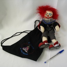PALHAÇO DE PANO (30 CM), COM CABELOS EM PLUMAS VERMELHAS, VESTINDO CALÇA XADREZ CINZA E PRETA, COM SUSPENSÓRIO; CAMISETA PRETA COM DESENHO DE UM CIRCO E 'CIRCO DE TODO MUNDO'. POSSUI ESTRUTURA DE ARAME POR DENTRO. ACONDICIONADO EM SACO PRETO DE PANO, COM MESMA ESTAMPA DA CAMISETA NA FRENTE.