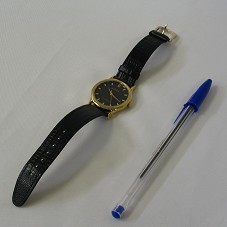 RELÓGIO ANALÓGICO DE PULSO, DA MARCA QUARTZ/MASSON. RELÓGIO DE FUNDO PRETO COM ARO E MARCAÇÃO DE NÚMEROS EM DOURADO; PULSEIRA EM COURO TRABALHADO. ACONDICIONADO EM ESTOJO DE VELUDO PRETO (9X9X5 CM).