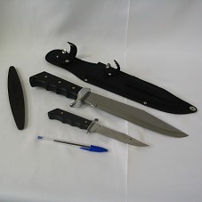 CONJUNTO DE DUAS FACAS (23 CM E 39,5 CM) EM AÇO,COM CABO PRETO EM RESINA. A MENOR (AÇO INOX) POSSUI SERRA EM UM DOS LADOS, DESENHO DE UM PEIXE FISGANDO ANZOL E 'FISH'. NA MAIOR (AÇO CARBONO), DESENHO DE UM JACARÉ E 'PANTANAL'. AMBAS ACONDICIONADAS EM BAINHA DE TECIDO PRETO. ACOMPANHA PEDRA OVALADA PARA AFIAR AS FACAS.