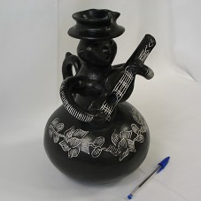 ESCULTURA EM CERÂMICA (17X29,5 CM), NA COR PRETA, COM DESENHOS BRANCOS DE ROSAS NO BOJO. FIGURA DE UMA MULHER COM CHAPÉU, TOCANDO UMA VIOLA. ESCULTURA SERVE COMO JARRO, SENDO OCA POR DENTRO E POSSUINDO UMA ALÇA NA PARTE POSTERIOR. NO FUNDO DA BASE, 'VICTORINA GALLEGOS / QUINCHAMALI / CHILE'. ACOMPANHA FOLHETO EM ESPANHOL E INGLÊS COM TEXTO 'UNA SEÑORA DE BARRO' DE PABLO NERUDA. ACONDICIONADA EM CAIXA PRETA COM TAMPA BRANCA (21X20,5X30,5 CM), POSSUINDO A INSCRIÇÃO 'FRAGMENTS OF CHILE'.