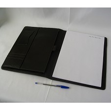 PASTA EM COURO MARROM (24,5X31,5X2 CM). NA PARTE INTERNA, BLOCO DE RASCUNHO COM FOLHAS BRANCAS E O NOME DO PRESIDENTE 'LUIZ INÁCIO LULA DA SILVA' IMPRESSO NA PARTE SUPERIOR; REPARTIÇÕES PARA CANETA, CARTÕES E PAPÉIS. ACONDICIONADA EM CAIXA DE PAPELÃO (26,5X33,5X2,5 CM) COM INSCRIÇÃO EM DOURADO 'DAIMLER CHRYSLER' NA TAMPA.