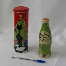 ESCULTURA EM CERÂMICA (5,5X17 CM), PEÇA ÚNICA E EXCLUSIVA, NO FORMATO DA ANTIGA GARRAFA DE COCA-COLA. PINTADA EM CREME E VERDE, COM DESENHOS DE FLORES VERMELHAS NA BASE E DE DOIS ROSTOS NO BOJO. POSSUI ASSINATURA DA ARTISTA ABAIXO DE UM DOS DESENHOS DE ROSTOS. FUNDO DA 'GARRAFA' FURADO, COM PEQUENAS RANHURAS/RACHADURAS. ACOMPANHA INFORMATIVO EM FORMA DE GARRAFA, SOBRE A ARTISTA PLÁSTICA E DESEJANDO UM FELIZ NATAL. ACONDICIONADA EM EMBALAGEM CILÍNDRICA, TIPO LATA METÁLICA, VERMELHA, COM DESENHO DE UMA ÁRVORE DE NATAL E DE UM GATO, ASSINADO PELA MESMA ARTISTA.