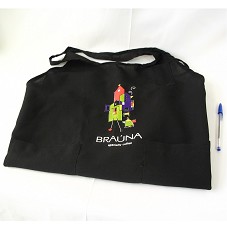 AVENTAL EM TECIDO PRETO, COM DOIS BOLSOS NA PARTE FRONTAL E UM BOLSO SUPERIOR PARA CANETA. NA FRENTE, DESENHOS DE CASAS EM FORMATO DE BULES, NAS CORES VERDE, VERMELHO, AMARELO E ROXO, COM A INSCRIÇÃO 'BRAÚNA SPECIALTY COFFEE'.