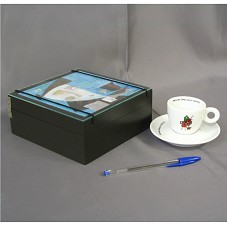 XÍCARA DE CAFÉ E PIRES EM CERÂMICA BRANCA. NA FRENTE DA XÍCARA , DESENHOS DE CASAS EM FORMATO DE BULES, NAS CORES VERDE, VERMELHO, AMARELO E ROXO; E NA PARTE INTERNA A INSCRIÇÃO 'BRAÚNA SPECIALTY COFFEE'. NO PIRES, MESMA INSCRIÇÃO. ACONDICIONADOS EM CAIXA DE MDF (17X17X8,5 CM) PINTADA EXTERNAMENTE DE PRETO, COM VIDRO NA TAMPA PROTEGENDO DESENHO ASSINADO POR 'SERGIO RAMOS'. DESENHO COM FUNDO AZUL, MOSTRANDO UMA PESSOA TOMANDO CAFÉ. ACOMPANHA INFORMATIVO SOBRE O CAFÉ BRAÚNA.