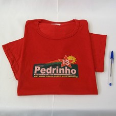 CAMISETA EM MALHA VERMELHA, DE MANGA CURTA. NA FRENTE, ESTAMPA NAS CORES VERDE, BRANCA E AMARELA: 'PREFEITO PEDRINHO / VICE HÉLIO DO ENÉZIO / UNIÃO DOM CAVATI MELHOR PT PMDB / AMO MINHA CIDADE. QUERO NOVO PREFEITO', DESENHO DE UM SOL E DA ESTRELA DO PT. ATRÁS, 'VEREADORA REGINA / VOTE 13617'.