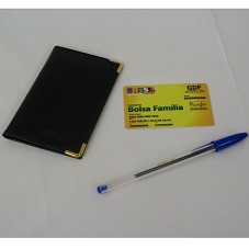 CARTÃO (8,5X5,5 CM) EM PLÁSTICO DURO, TIPO CARTÃO DE CRÉDITO, NA COR AMARELA, DO 'PROGRAMA BOLSA FAMÍLIA', EM NOME DE 'LUIZ INÁCIO LULA DA SILVA', DE NUMERAÇÃO ZERO. ACONDICIONADO EM PORTA-CARTÃO (7,8X12,2 CM) DE COURO PRETO, COM DETALHES EM METAL DOURADO, TENDO NA PARTE FRONTAL A INSCRIÇÃO 'CARTÃO BRB'. ESTE, EMBALADO EM PAPEL CRAFT COM MESMA INSCRIÇÃO.