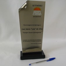 PLACA (27X13,5) EM METAL PRATEADO COM A PARTE SUPERIOR ESQUERDA E TODA PARTE INFERIOR DOBRADAS. POSSUI A INSCRIÇÃO 'SETEMBRO / IPIRANGA ESTÁ EM FESTA / HOMENAGEM DO IPIRANGA A LUIZ INÁCIO ''LULA'' DA SILVA / ''SEMPRE ILUSTRE IPIRANGUISTA'' / COMISSÃO ORGANIZADORA DOS FESTEJOS DE ANIVERSÁRIO DO BAIRRO DO IPIRANGA / 25 DE SETEMBRO DE 2004'. FIXADA EM BASE PRETA (1,5X13X7,5 CM).