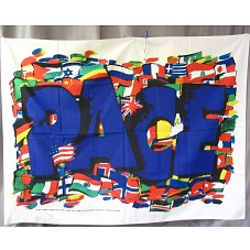 BANDEIRA BRANCA (131X100 CM), COM A PALAVRA 'PACE' ESCRITA EM AZUL, SOBRE BANDEIRAS DE DIVERSOS PAÍSES. NA PARTE INFERIOR A INSCRIÇÃO '1997 - SERMIG - ARSENALLE DELLA PACE - TORINO - ITALY - GEMELLATO CON IL SACRO CONVENTO DI S.FRANCESCO IN ASSISI'.