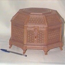 PORTA-JÓIAS OITAVADO (26X26X19 CM ), EM MADEIRA SÂNDALO, TRABALHADO COM MOTIVOS FLORAIS ESCULPIDOS, FORMANDO CHEIOS E VAZIOS.