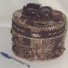 CAIXA CIRCULAR (19,5X13,5 CM) EM PAPELÃO. DECORADA COM VÁRIOS APETRECHOS: CHAVES, BRINCOS, MIÇANGAS, BIJUTERIAS, PEDRAS, ETC, TODOS COLADOS NA PARTE EXTERNA DA CAIXA.