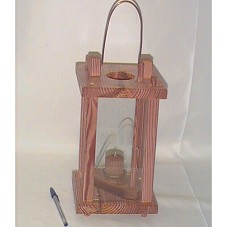 LAMPARINA (15X15X25,5 CM) COM ESTRUTURA EM MADEIRA, FECHAMENTO EM VIDRO E ALÇA EM ARAME. NO INTERIOR, VELA COLOCADA EM FÔRMA DE EMPADA, NUM SUPORTE DE MADEIRA. POSSUI ORIFÍCIO NA PARTE SUPERIOR, PARA COLOCAÇÃO DE NOVA VELA, PUXADA POR HASTE DE MADEIRA. EM UMA DAS LATERAIS, GRAVADO NO VIDRO, 'HOTEL STA. ESMERALDA' E LOGOTIPO DO MESMO.