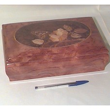 PORTA-JÓIA EM MADEIRA (28,5X18X8,5 CM), COM TAMPA TRABALHADA EM MARCHETARIA, FAZENDO DESENHO DE UMA BORBOLETA POUSADA NUMA FLOR. INTERIOR FORRADO EM VELUDO PRETO. ACONDICIONADA EM EMBALAGEM PRÓPRIA (33,5X22X11 CM) COM ADESIVO 'MARCHETARIA DO ACRE' NA TAMPA. NO INTERIOR DA TAMPA, INFORMAÇÕES SOBRE O PROJETO.