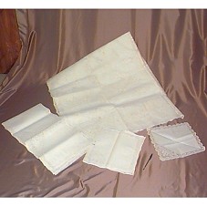 TOALHA DE MESA (170X330 CM) EM LINHO BRANCO, BORDADA EM LABIRINTO. POSSUI DOZE GUARDANAPOS (33X33 CM) EM MESMO MATERIAL, ESTANDO UM SOLTO E OS OUTROS ONZE AINDA PRESOS UNS AOS OUTROS. ACOMPANHA CARTÃO DO REMETENTE, PRIMEIRA DAMA MARISA LETÍCIA, COM OS CUMPRIMENTOS DO BANCO DO NORDESTE. CORDIALMENTE, ROBERTO SMITH / PRESIDENTE / FORTALEZA, 17 DE MARÇO DE 2004'.