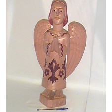 ESCULTURA (52 CM) EM MADEIRA. FIGURA DE UM ANJO, COM MÃOS EM POSIÇÃO DE ORAÇÃO. TÚNICA COM MOTIVOS FLORAIS, PINTADOS DE VINHO. NA BASE, A INSCRIÇÃO 'KIM TE-PI 2004'. ASAS ENCAIXADAS NAS COSTAS. ACONDICIONADO EM CAIXA DE PAPELÃO.