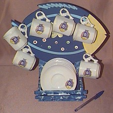 CONJUNTO PARA CAFÉ, EM PORCELANA BRANCA, COMPOSTO POR SEIS XÍCARAS E SEIS PIRES. TODOS ELES POSSUEM PINTURA DE UM PEIXE AZUL E AMARELO, COM MOTIVOS COLORIDOS. ACOMPANHA SUPORTE DE MESA, EM MADEIRA, PINTADO NO COR AZUL, COM MANCHAS BRANCAS, POSSUINDO DESENHO DO MESMO PEIXE, ONDE AS XÍCARAS SÃO PENDURADAS POR MEIO DE GANCHOS. ACONDICIONADO EM CAIXA DE PAPELÃO.