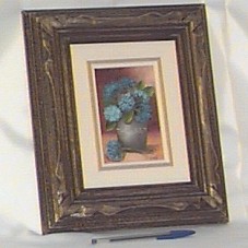 QUADRO (27,5X32,5 CM) COM PINTURA (9X14 CM) DE UM VASO COM HORTÊNSIAS AZUIS. NO CANTO INFERIOR DIREITO, ASSINATURA 'THERÊ'. MOLDURA EM MADEIRA COM PÁTINA DOURADA E PASSE-PARTOUT NA COR CREME. ATRÁS DA TELA, 'THEREZINHA DE PAULA E OLIVEIRA / BRASÍLIA-DF / ABRIL 2004'. NO CANTO INFERIOR ESQUERDO POSTERIOR DO QUADRO, ETIQUETA COM INFORMAÇÕES DO ARTISTA, ENDEREÇO E TELEFONE DO ATELIER.