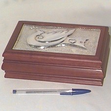 PORTA-JÓIAS (20X13,5X6 CM) EM MADEIRA. NA TAMPA, TRABALHO EM PRATA, COM DESENHO DE UM PÁSSARO SEGURANDO UMA FLOR, TENDO DUAS PEDRAS (UMA NO OLHO E OUTRA NA CALDA) TIPO BRILHANTE.