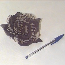BROCHE EM FORMATO DE FLOR DE SEDA (12,5X3,5 CM) NAS CORES PRETA E BRANCA. ACONDICIONADO EM CAIXA CIRCULAR (18,5X6,5 CM).