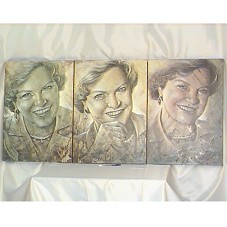 PINTURA EM TELA DE MADEIRA (49,5X70 CM) COMPOSTA POR TRÊS TELAS ARTICULADAS, DE IGUAIS TAMANHOS. CADA UMA POSSUI UM RETRATO PINTADO DA PRIMEIRA DAMA MARISA LETÍCIA LULA DA SILVA, EM TONS DE VERDE, AMARELO E MARROM. NO CANTO INFERIOR DIREITO DA TERCEIRA TELA, 'ROBERTO CAMASMIE 2003'.