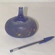 VASO SOLITÁRIO DE CRISTAL AZUL (9X7X8,2 CM). POSSUI BOJO FOSQUEADO E TEXTURIZADO, COM PINTURAS NAS CORES AMARELO, LARANJA E MARROM. GARGALO EM CRISTAL AZUL TRANSLÚCIDO. NA FRENTE, SELO 'KOSTA BODA / SINCE 1742'. NO FUNDO DO VASO, INSCRIÇÃO 'KOSTA BODA....' E OUTRAS QUE NÃO FORAM IDENTIFICADAS. ACOMPANHA CARTÃO DO REMETENTE, 'MRS. MARISA LETICIA DA SILVA / KOFI A. ANNAN / NANE ANNAN'. ACONDICIONADO EM CAIXA FORRADA DE VELUDO AZUL MARINHO (15X15X9 CM).