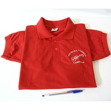 CAMISA GOLA POLO (TAM M), NA COR VERMELHA. DO LADO ESQUERDO FRONTAL E NA MANGA DIREITA, BORDADOS UM VIOLÃO E A INSCRIÇÃO 'ORQUESTRA CABOCLA / CAMPINAS'.