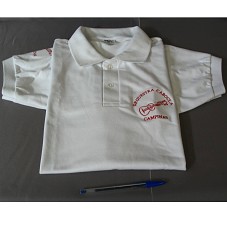 CAMISA GOLA POLO (TAM M), NA COR BRANCA. DO LADO ESQUERDO FRONTAL E NA MANGA DIREITA, BORDADOS EM VERMELHO, UM VIOLÃO E A INSCRIÇÃO 'ORQUESTRA CABOCLA / CAMPINAS'. ACOMPANHA UM CARTÃO DE VISITA DA ORQUESTRA CABOCLA E UM CARTÃO COM A INSCRIÇÃO 'LUÍS ERLANGER / PREZADA DONA MARISA. PEDAÇOS DO BRASIL QUE A GENTE VÊ POR AQUI / ABRAÇO,'