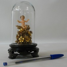 OBJETO DE DECORAÇÃO (7,5X13,5 CM). RETRATA UMA CRIANÇA SENTADA EM PLANTAS E FLORES DOURADAS, AZUIS, VERMELHAS E VERDES, EM UMA REDOMA DE VIDRO COM A BASE EM MADEIRA ENVERNIZADA. ACONDICIONADA EM UMA CAIXA DE PAPELÃO VINHO (13X13X10 CM).